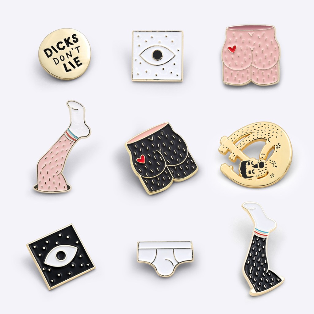 I also have a addiction of collecting underwear (briefs in particular) and I got a tattoo of a pair of briefs on my arm. As a tribute to this, I made this my first pin (https://dicksdontlie.com/shop/products/pin-room-with-a-view/). After that, the rest followed (logo, website, unisex apparel collection, bags, limited edition screen prints, greetings cards, pins, packaging, illustrations, photography, etc.).