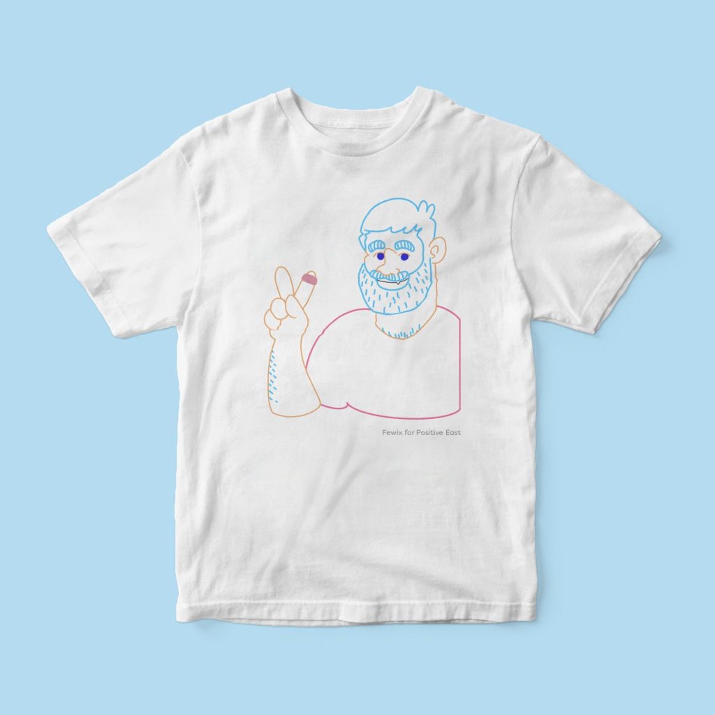 In 2020 the project was such an exciting moment for the charity and was an important way for us raise essential funds in the shadow of another global pandemic, COVID19. Today we very much wanted to bring the project back to reflect our work as a charity now in 2023 and to tie it in with our annual queer art/makers market, Q-MART. We asked the contributing artists to design a tee they felt reflected the mission of the charity which would form part of Q-MART 2023. Through this we received 23 brilliant new contributions, all reflecting the ethos Positive East, allowing the project to act as a stunning artistic archive.